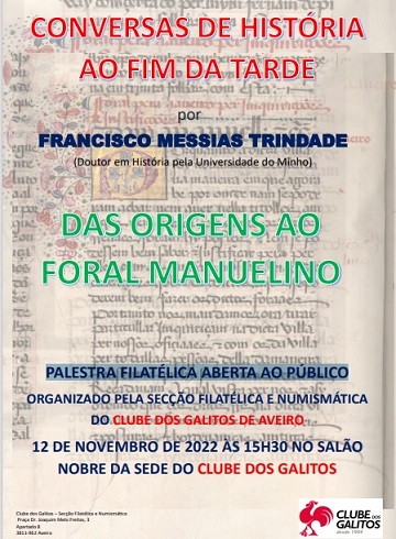 Pelas 15h30, no Salão Nobre da Sede do Clube, teremos uma palestra filatélica aberta ao público, da autoria do Doutor Francisco Messias Trindade, com o tema "Das Origens ao Foral Manuelino".